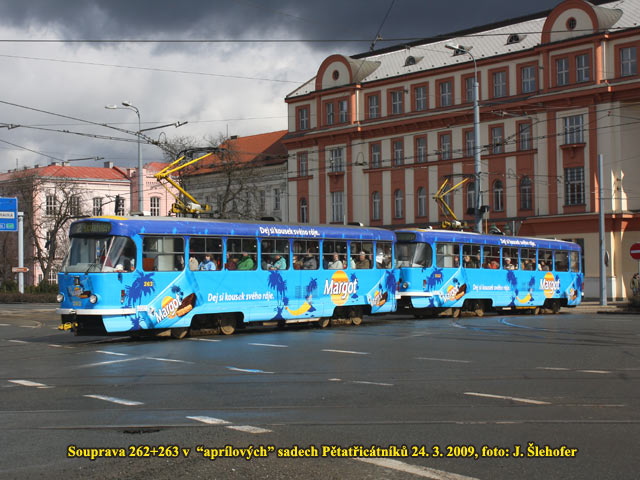 Souprava 262+263 v sadech Pětatřicátníků nasvícená sluníčkem v kontrastu s černou oblouhou v pozadí 24. 3. 2009 Souprava 262+263 na Gerské třídě 31. 3. 2009 Stejně jako v dalších městech se i v Plzni objevuje povedená modrá reklama na tyčinky Margot. Dostaly jí vozy soupravy 262+263, v provozu se objevují od 24. 3. 2009 a jsou opravdu k nakousnutí. Bohužel však z vozů již mizí po půl roce, tedy v druhé polovině září 2009.