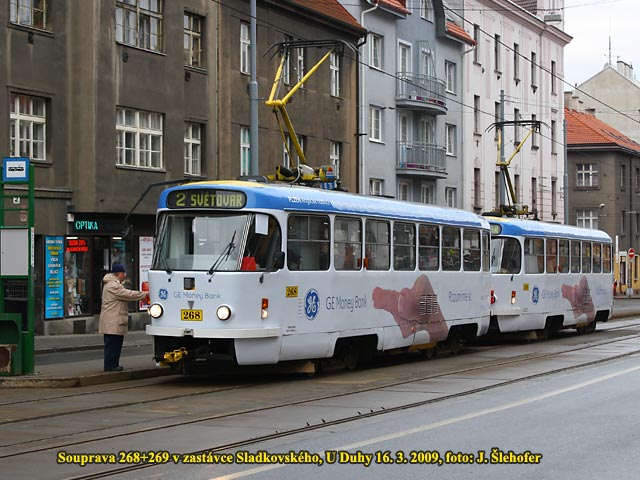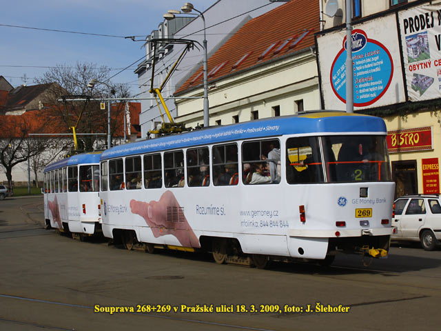Souprava 268+269 v zastávce Sladkovského, U Duhy 16. 3. 2009 Souprava 268+269 v Pražské ulici 18. 3. 2009 Na soupravu 268+269 byla vylepena reklama GE Money Bank v bílomodré barevné kombinaci. S reklamními letáky GE Money Bank se setkáme i v reklamních boxech uvnitř vozy. V provozu je v této podobě od 16. 3. 2009.