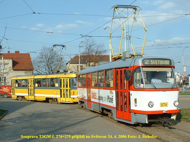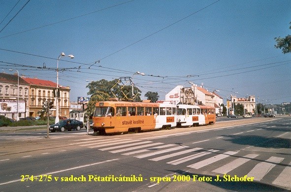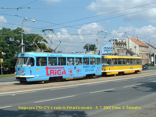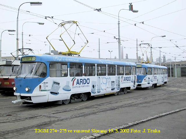 Souprava 270+271 - Triga - Barvy a laky projíždí přes sady Pětatřicátníků 5. 7. 2002 Souprava T3GM 274+275 ve vozovně Slovany V červenci dostal světle modrý kabát vůz č. 270 nesoucí nyní reklamu na barvy a laky. Souprava 274+275, než vyjela po modernizaci do pravidelného provozu, dostala reklamu na elektrospotřebiče Ardo.