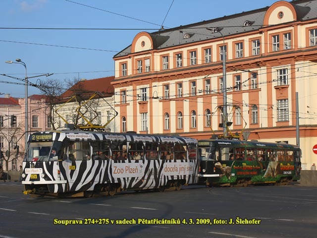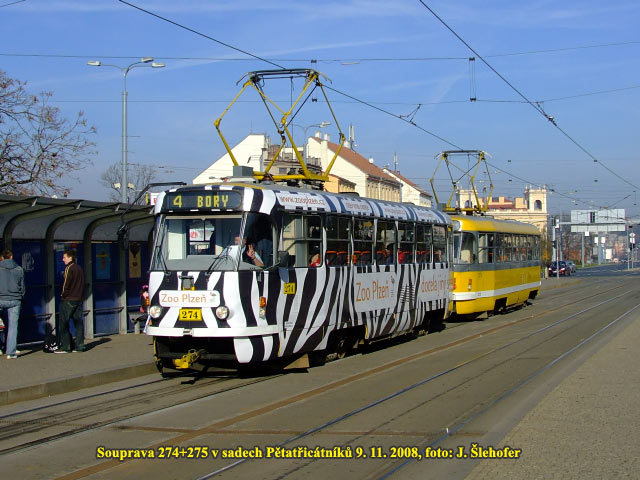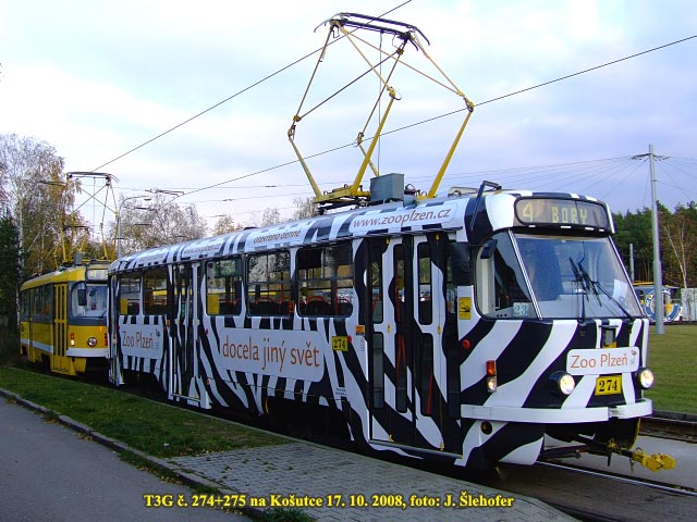 Souprava 274+275 s reklamou na ZOO na Košutce 17. 10. 2008 Souprava 274+275 s reklamou na ZOO v sadech Pětatřicátníků 9. 11. 2008 Po delší době se objevuje opět nová reklama na tramvaji T3. Konkrétně vůz T3G č. 274 jezdí v "zebřím" kabátě s další reklamou na plzeňskou ZOO. V této podobě je v provozu od 17. 10. 2008.
