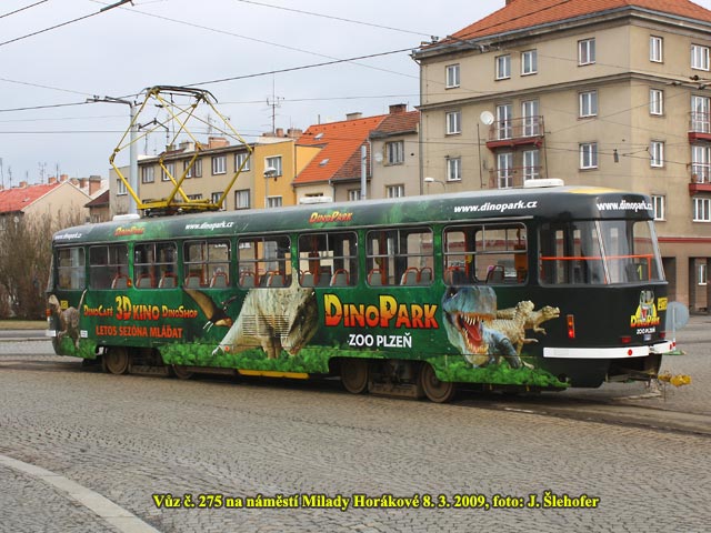 Souprava 274+275 v sadech Pětatřicátníků 4. 3. 2009 275 na náměstí Milady Horákové 8. 3. 2009 Od pátku 27. 2. 2009 vozí vůz č. 275 nově reklamu na Dinopark. Jedná se o podobnou reklamu, jako již byla na postupně na vozech 110 a 259.