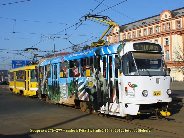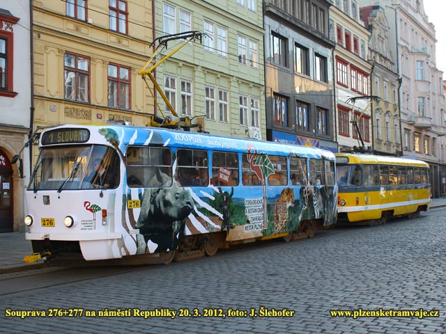 Souprava 276+277 s reklamou na Zoo na náměstí Republiky 20. 3. 2012 Souprava 276+277 v sadech Pětatřicátníků 16. 3. 2012 Od 15. 3. 2012 vozí reklamu vůz č. 276 (ze soupravy 276+277). Propaguje Zoologickou a botanickou zahradu města Plzně. Jedná se již o několikátou podobu reklamy na ZOO na plzeňských tramvajích.
