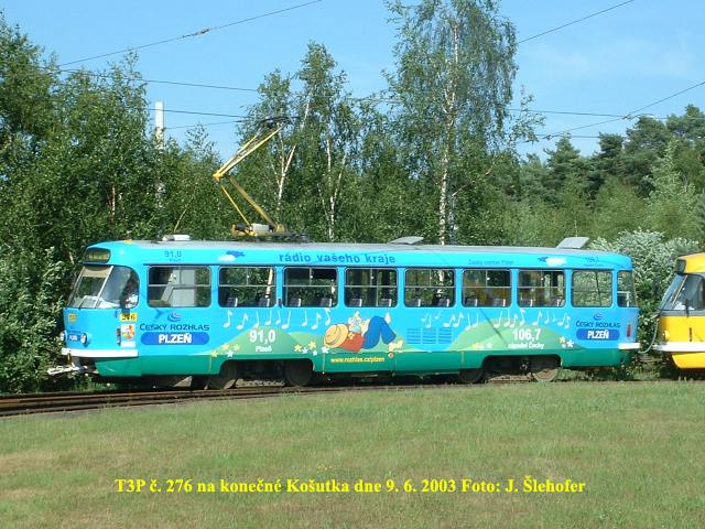 276+277 na konečné Košutka 9. 6. 2003 T3P 248+249 v sadech Pětatřicátníků 30. 9. 2003 Od šestého června 2003 byla v provozu nová reklama na prvním voze soupravy T3P 276+277. Ve světlemodrém provedení propagovala do září 2004 český rozhlas Plzeň. Na fotografii vlevo je zachycena 9. 6. 2003 na konečné Košutka. Vpravo je pak zachycena dne 30. 9. 2003 v sadech Pětatřicátníků souprava T3P 248+249 první den v provozu s reklamou na elektrospotřebiče LG. Později ji někteří začali říkat rakev. V této podobě jezdila do poloviny října 2004, nyní je opět žlutošedá.