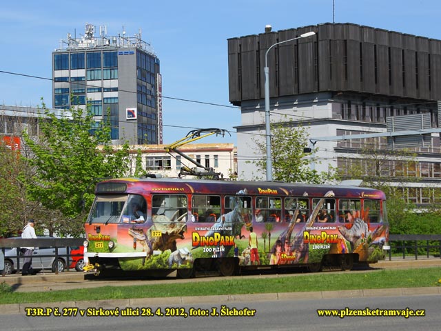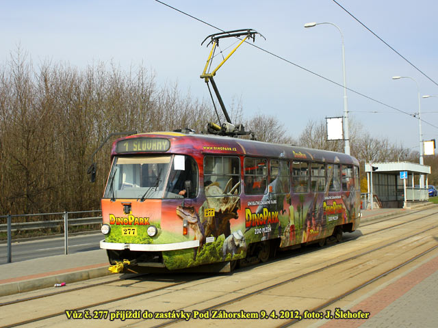 277 přijíždí do zastávky Pod Záhorskme 9. 4. 2012 277 v Sirkové ulici 27. 4. 2012 Na voze 277 se od 5. 4. 2012 objevuje reklama na Dinopark. O víkendu se objevuje sólo a v pracovní dny v soupravě s reklamou na ZOO, podobně jako dřívější soupravy: 109+110, 258+259 a 274+275.