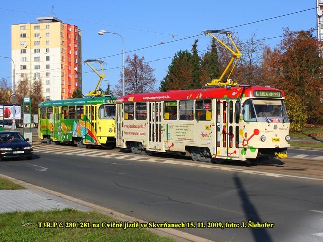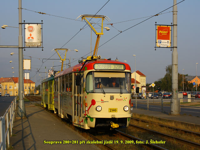 Souprava 280+281 při zkušební jízdě v zastávce Výstaviště 19. 9. 2009 Souprava 280+281 při cvičné jízdě ve Skvrňanech 15. 11. 2009 Koncem září se na zkušebních jízdách objevuje po velké prohlídce souprava 280+281 s novou reklamou. Po delší době se jedná o vozy kdy je jako podklad pro reklamu použit přímo nátěr, obvykle jsou totiž dnes celovozové reklamy tvořeny jen polepem. Souprava propaguje Plzeňskou vstupenku, Plzeňskou kartu a Plzeňskou jízdenku a v provozu je s cestujícími je od října 2009.