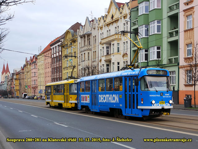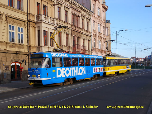 Souprava 280+281 v Pražské ulici 31. 12. 2015 Souprava 280+281 na Klatovské třídě 31. 12. 2015 Od 21. 12. 2015 jezdí vůz č. 280 ze soupravy 280+281 v modré podobě s reklamou na obchod se sportovními potřebami Decathlon. Reklama je na voze přibližně přes rok.
