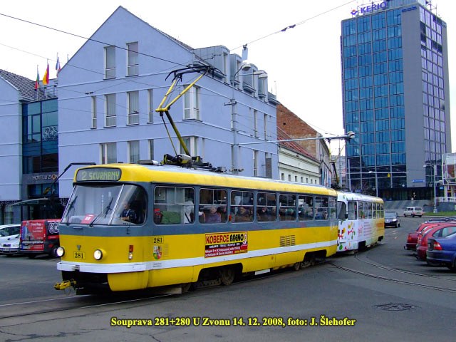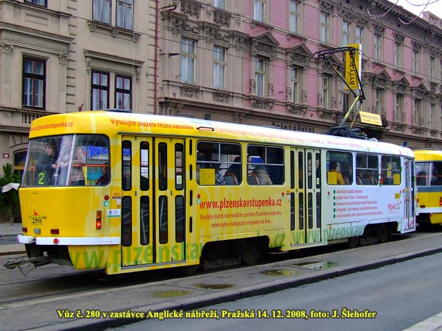 Souprava 280+281 U Zvonu 14. 12. 2008 Vůz 280 s reklamou Plzeňská vstupenka 14. 12. 2008 Vůz č. 280 (v současné době zadní ze soupravy 281+280) jezdí od 10. 12. 2008 s celovozovou reklamou Plzeňská vstupenka. Vůz dosud vozil pozůstatky reklamy na již neexistující cestovní kancelář při PMDP. Reklama na Plzeňskou vstupenku je v provozu do konce dubna 2009.