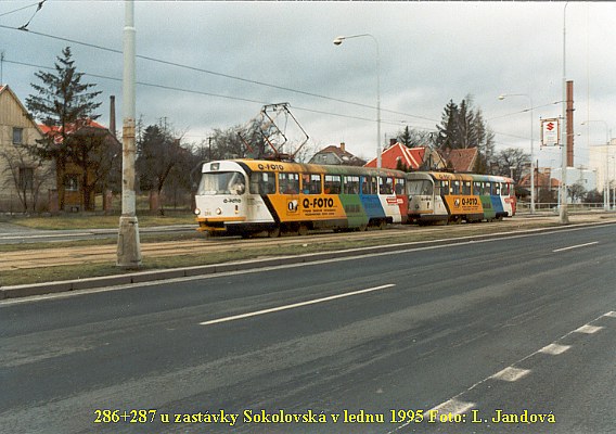 286+287 s reklamou na Q-foto Takto ušmudlaná jezdila 286+287 několik let Souprava 286+287, vlevo v roce 1995 s reklamou na Q-foto a vpravo z pozdější doby po jejím sloupání. Takto dělala tato souprava ostudu v provozu asi dva roky. Až v srpnu 2001 se podařilo trochu slušněji odstranit zbytky této reklamy. Po Plzni bylo možné často spatřit i několik dalších vozů se sloupanými reklamními nápisy, v původním barevném provedení reklamy.
