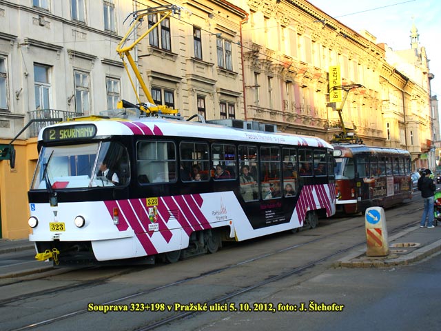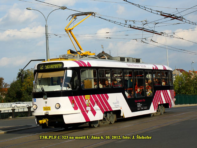 323 s reklamou Plzeňské filharmonie na mostě U Jána 6. 10. 2012 323 s reklamou Plzeňské filharmonie nahardí reklamou na 198, dočasěn se spolu objevily i v soupravě 5. 10. 2012 Od 2. 10. 2012 se objevuje nová reklama na Plzeňskou filharmonii na voze T3R.PLF č. 323. Tedy první celovozová reklama na tomto typu v Plzni. Podoba reklamy je však dle mého názoru nevýrazná a nic neříkající. Po dvou letech nahradí reklamu na voze 198, se kterým se také dočasně objevovaly v soupravě a který odchází do dílen ne velkou prohlídku.