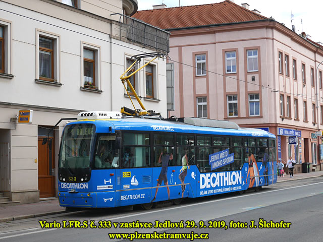 Vario LFR.S č. 333 ve Skvrňanech 23. 9. 2019 Vario LFR.S č. 333 v zastávce Jedlová 29. 9. 2019 Vario LFR.S č. 333 vozí novou reklamu Decathlon. Poprvé v provozu 23. 9. 2019 na lince č. 2. Že by se tento obchodním dům se sportem připravoval na sousedství s tramvajovou konečnou? ;) Ne, spíše shoda okolností. Bohužel přístup obchodních domů k veřejné dopravě je nadále spíše negativní. Příkladem jsou právě nové obchody sousedící s Decathlonem, odkud se však s přístupem k tramvají vůbec nepočítá. :( Reklama na voze č. 333 je přibližně dva roky. V polovině října 2021 je vůz opět žlutošedý.