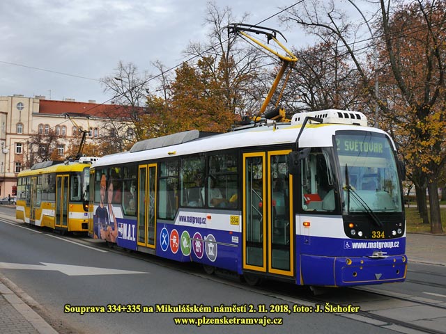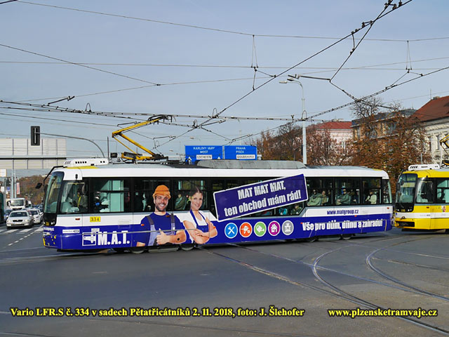 Vario LFR.S č. 334+335 v sadech Pětatřicátníků 2. 11. 2018 Vario LFR.S č. 334+335 na Mikulášském náměstí 2. 11. 2018 Na Variu LFR.S č. 334 (soupravy 334+335) se od 2. 11. 2018 objevuje nový modrý a bílý polep s reklamou obchodu M.A.T.