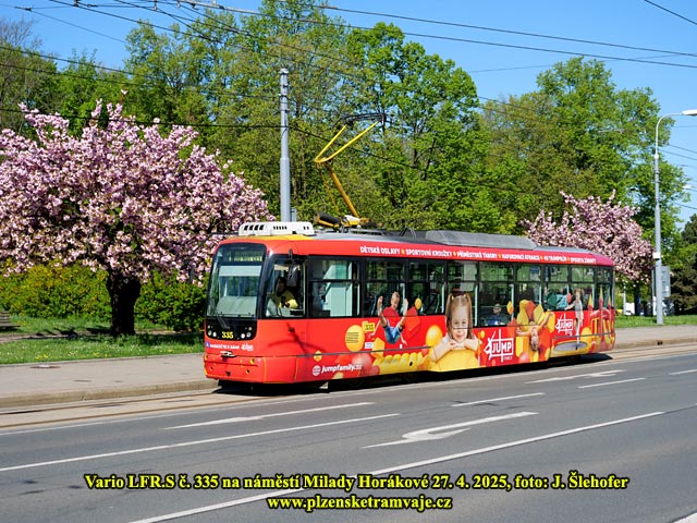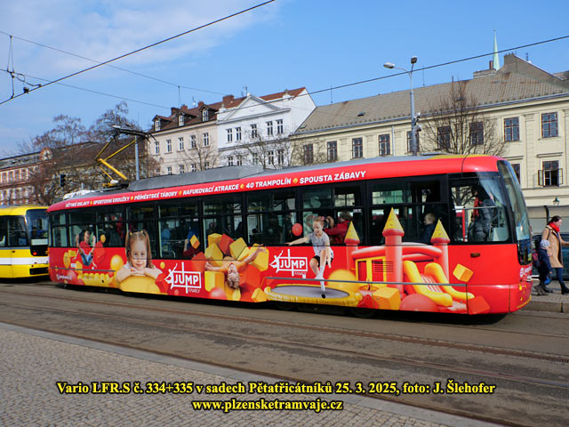 Souprava 334+335 v sadech Pětatřicátníků 25. 3. 2025 Vario LFR.S č. 335 na Slovanech 27. 4. 2025 Od 21. 3. 2025 je v provozu další tramvaj Vario LFR.S s celovozovou reklamou a sice vůz č. 335. Jeho převážně červený polep propaguje zábavně sportovní centra JUMP Family.