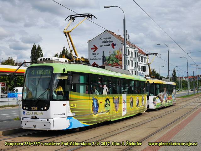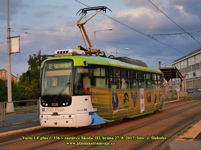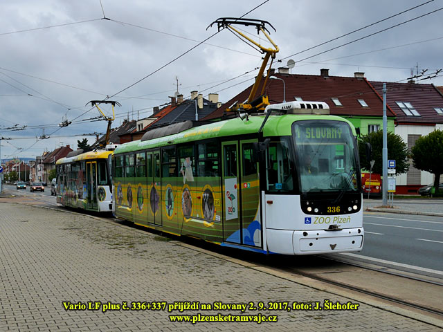 Vario LF plus č. 336 v sadech Pětatřicátníků 27. 8. 2017 Vario LF plus č. 336 přijíždí do zastávky Škoda III. brána 27. 8. 2017 Souprava 336+337 přijíždí na Slovany 2. 9. 2017 Souprava 336+337 v zastávce Pod Záhorskem 3. 9. 2017