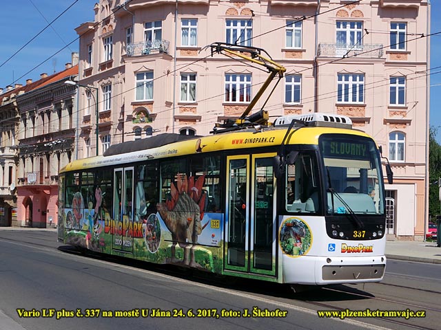 Vario LF plus č. 337 na mostě U Jána 24. 6. 2017 Vario LF plus č. 336+337 na náměstí Republiky 10. 6. 2017 Začátkem června 2017 dostal vůz Vario LF plus č. 337 celovozový polep s reklamou na Dinopark. Z provozu tak dočasně zmizel další stříbrnozlatý vůz.