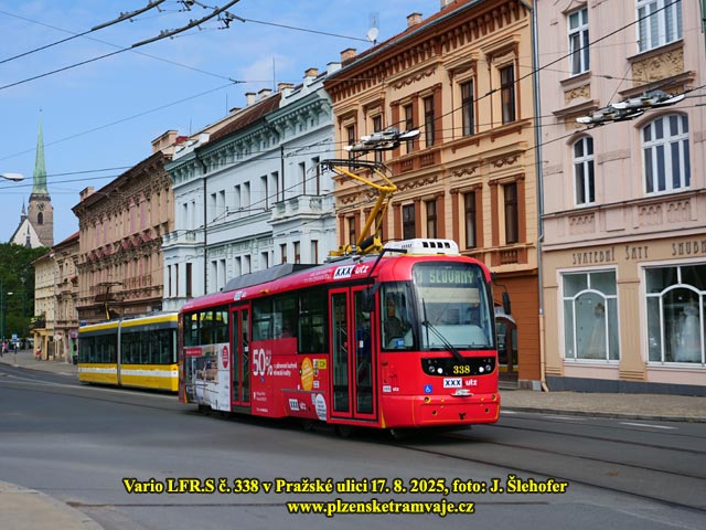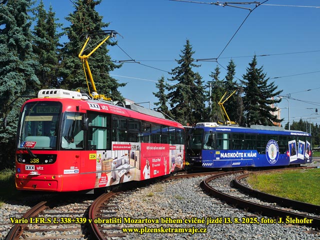 Vario LFR.S č. 338+339 v obratišti Mozartova 13. 8. 2025 Vario LFR.S č. 338 v Pražské ulici 17. 8. 2025 Od 13. 8. 2025 pak vůz č. 338 jezdí s červeným polepem XXX Lutz. Poprvé v této podobě vyjíždí na cvičné jízdy ve dnech 13. a 14. 8. 2025 v soupravě s vozem 339 s reklamou Městské policie. Od 15. 8. 2025 jezdí pak tato souprava na pravidelných linkách.
