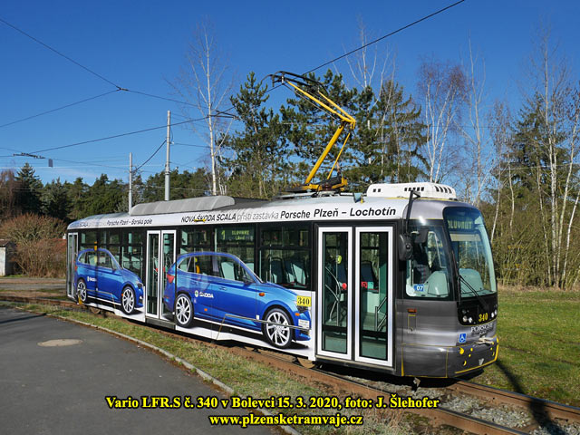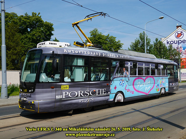 Vario LFR.S č. 340 s reklamou na autíčka na Mikulášské třídě 26. 5. 2019 Vario LFR.S č. 340 s reklamou na autíčka v Bolevci 15. 3. 2020 Reklamy propagující auta nemám osobně na tramvajích rád a možná i proto jsem jí sem zapomněl dát a doplňuji tak až po roce, že vůz č. 340 vyrazil s novou reklamou v květnu 2019. Vůz je v šedivém polepu s modrými auty a propaguje firmu Porsche Plzeň.