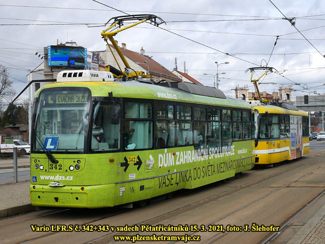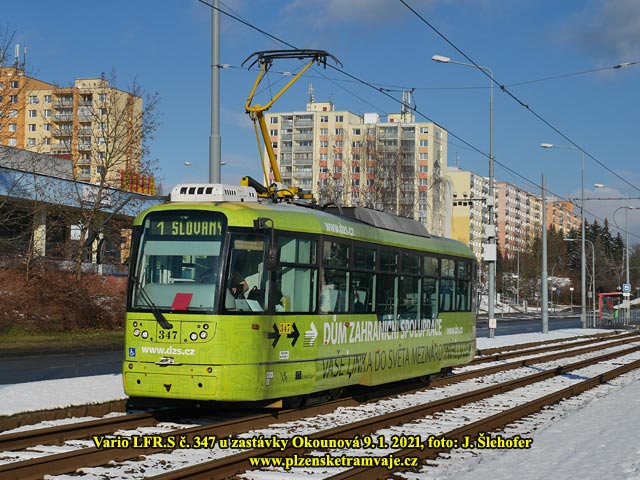 Vario LFR.S č. 347 na Lidické třídě 9. 1. 2021 Souprava Vario LFR.S č. 342+343 při cvičné jízdě v sadech Pětatřicátníků 15. 3. 2021 Zelenou nevýraznou reklamu dostaly před vánoci 2020 dva vozy Vario LFR.S. Jde vždy o přední vozy souprav č. 347 a 342. Inzerentem je Dům zahraniční spolupráce.