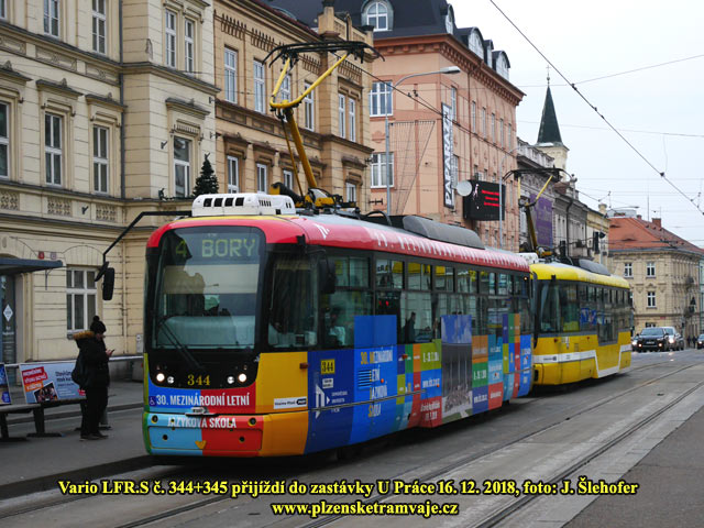 Souprava Vario LFR.S č. 344+345 v zastávce U Práce 16. 12. 2018 Další reklama, která se objevila začátkem prosince, je na tramvaji Vario LFR.S č. 344. Její celovozový polep propaguje Mezinárodní letní jazykovou školu ZČU. Na voze je však jen několik měsíců.