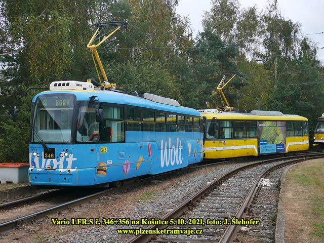 Vario LFR.S č. 346+356 na Košutce 5. 10. 2021 Vario LFR.S č. 346+356 na Karlovarské 5. 10. 2021 Vůz č. 346 dostal v polovině září 2021 modrý polep s reklamou firmy Wolt.