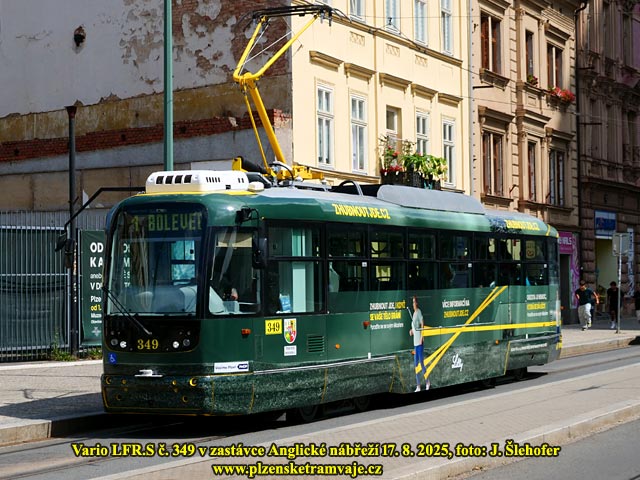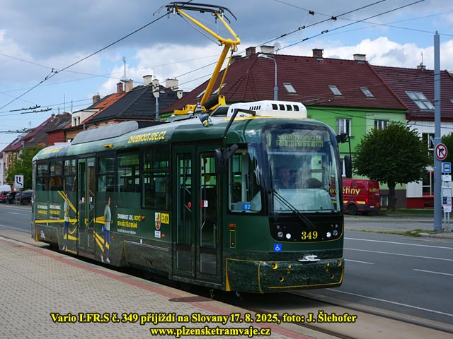 Vario LFR.S č. 349 17. 8. 2025 Vario LFR.S č. 349 17. 8. 2025 Na voze Vario LFR.S č. 349 je od 11. 8. 2025 zelený reklamní polep "zhubnoutjde.cz". Tramvaj v této podobě bohužel nepůsobí příliš fotogenicky.