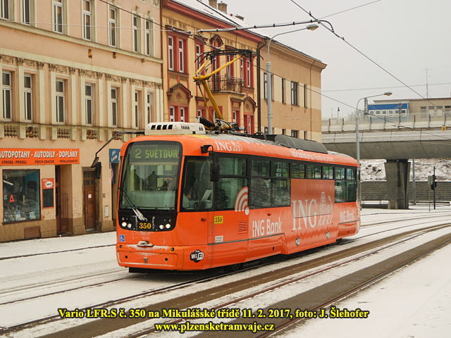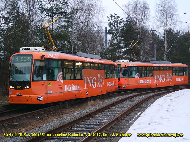 Souprava 350+351 na konečné Košutka 7. 2. 2016 Vůz č. 350 na Mikulášské třídě 11. 2. 2016 Od 7. 2. 2017 vyjíždí do provozu souprava vozů Vario LFR.S č. 350+351 s další reklamou ING Bank a nahrazuje tak soupravu 282+283. Součástí nové reklamy na vozech 350+351 je také internetové wifi připojení, které je pro cestující zdarma. V Plzni se jedná se o první tramvaje nabízející wifi připojení.