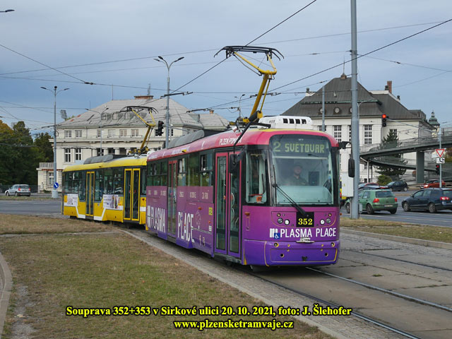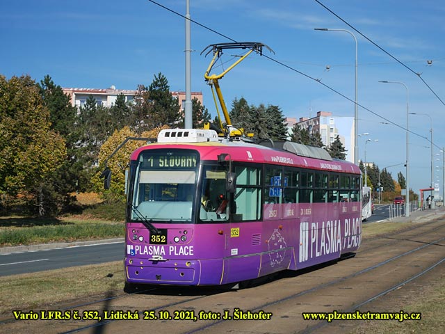 Vario LFR.S č. 352+353 v Sirkové ulici Košutce 5. 10. 2021 Vario LFR.S č. 352 na Lidické přijíždí ke Geře 5. 10. 2021 O měsíc pozdějí, tedy v polovině října 2021 vyjíždí vůz Vario LFR.S č. 352 s reklamou Plasma Place.