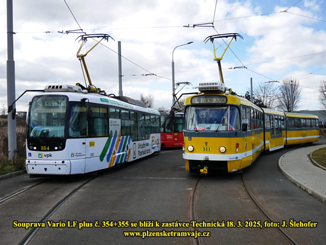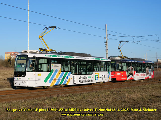 Souprava 354+355 se blíží k zastávce Technická 18. 3. 2025 Souprava 354+355 a K3R-NT č. 311 na konečné Univerzita 17. 3. 2025 Vůz Vario LF plus č. 354 dostal nový polep prezentující Virtuální Plzeňskou kartu. Tato nová aplikace, která může nahradit plastovou Plzeňskou kartu je nyní jako novinka hodně propagována. Poprvé v této podobě je vůz v provozu od 17. 3. 2025.