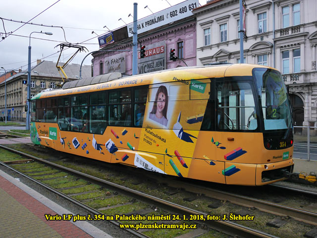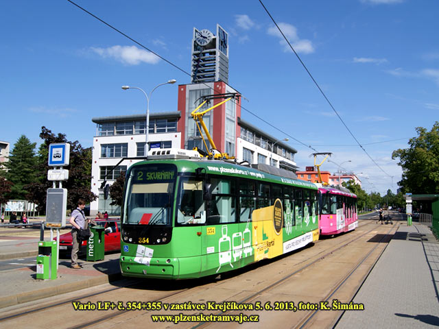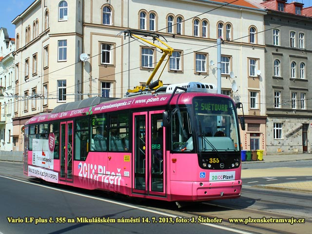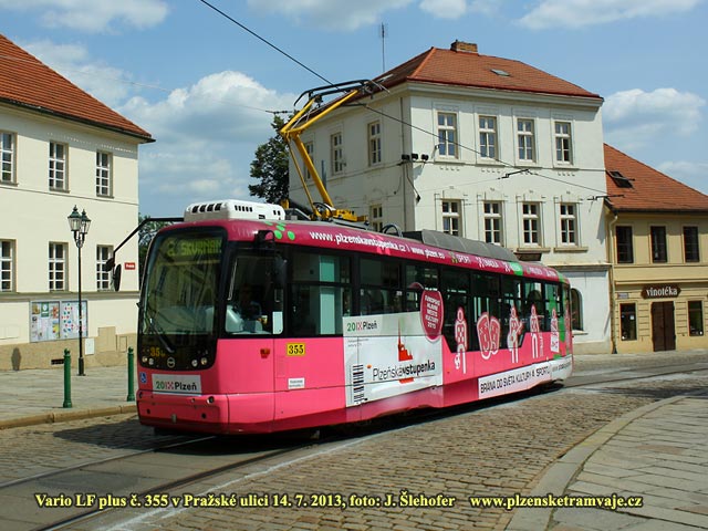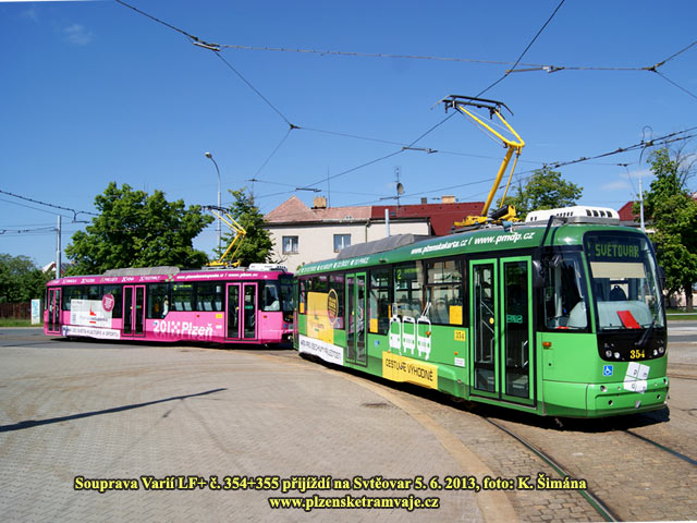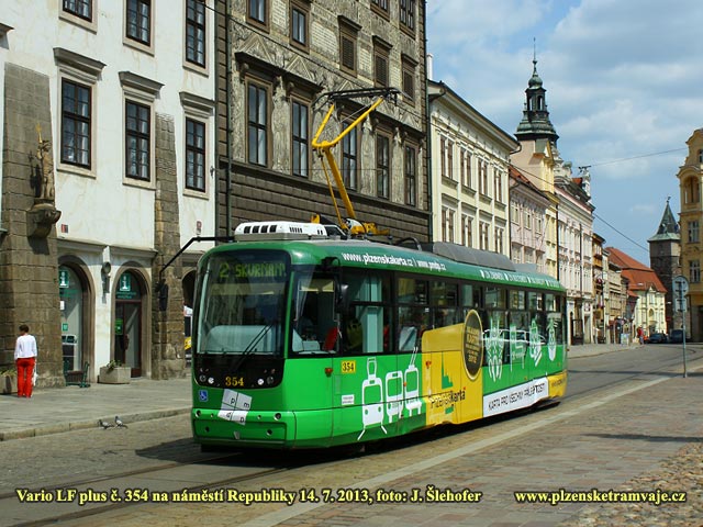 Vario LF plus č. 354+355 před budovou slovanské radnice 5. 6. 2013, foto: K. Šimána Od 3. 6. 2013 jsou v provozu vozy 354 a 355 s reklamním polepem na Plzeňskou kartu a Plzeňskou vstupenku. Jedná se o vozy Varilo LF plus, na kterých je díky reklamě tak schován atypický stříbrnozlatý nátěr. S tím se však můžeme setkat ještě na soupravě 336+337.