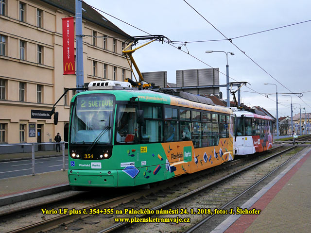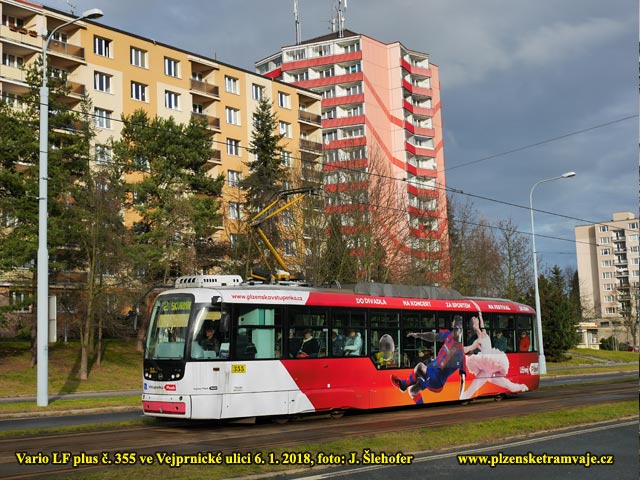 Vario LF plus č. 355 ve Vejprnické ulici 6. 1. 2018 Souprava 354+355 v zastávce Palackého náměstí 24. 1. 2018 Vario LF plus č. 355 na Slovanech 28. 4. 2018 Souprava 354+355 v zastávce Palackého náměstí 24. 1. 2018