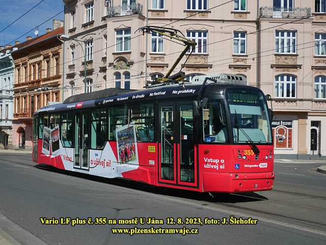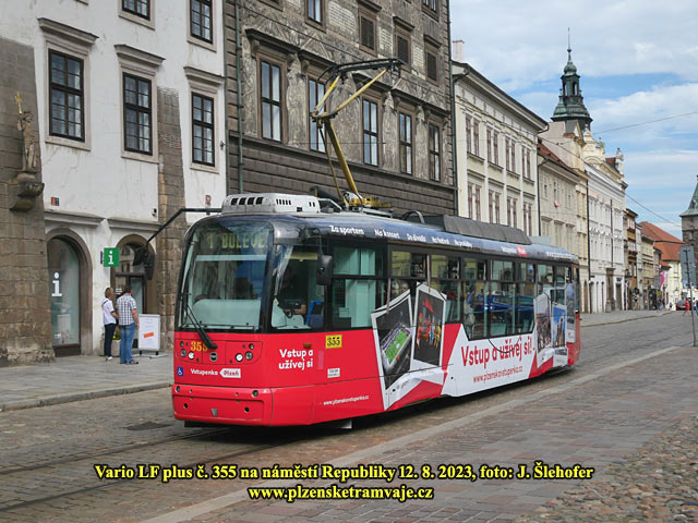 Vario LF plus č. 355 s novou reklamou na Plzeňskou vstupenku 12. 8. 2023 Vario LF plus č. 355 s novou reklamou na Plzeňskou vstupenku 12. 8. 2023 V srpnu 2023 byl obměněn polep na tramvaji Vario LF plus č. 355 propagující server Plzeňská vstupenka. Nyní převládá červená barva s fotografiemi z plzeňských kulturních akcí.