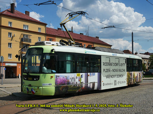 Vario LFR.S č. 360 na Slovanech 1. 5. 2025 Vario LFR.S č. 360 v Pražské ulici 17. 8. 2025 Od 1. 5. 2025 je v provozu Vario LFR.S č. 360 s celovozovou reklamou na Rodinné domy a byty Plzeň - Nová Valcha. Čelo vozu je světle zelené, jinak jsou na polepu převážně fotografie nových domů.