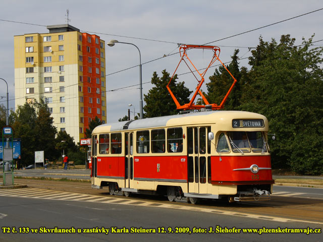 Mezi vozy T2 stojí vůz T1 při své poslední jízdě 4. 4. 1987 na konečné Skvrňany  Foto: J. Hertl Vozy KT8D5 se do Skvrňan dostanou zpravidla jen při výlukách - č. 290 dne 19. 11. 2000 T3M č. 229+230 v zastávce Ulice Terezie Brzkové 21. 4. 2003 KT8D5 v zastávce Macháčkova 19. 11. 2000