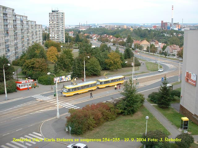 Škvrňany jsou pro mnohé obyvatele Plzně tak trochu stranou, a mnozí do této části města vůbec nepřijdou a ani sídliště Zastávka ulice Karla Steinera se soupravou 254+255 - 19. 9. 2004