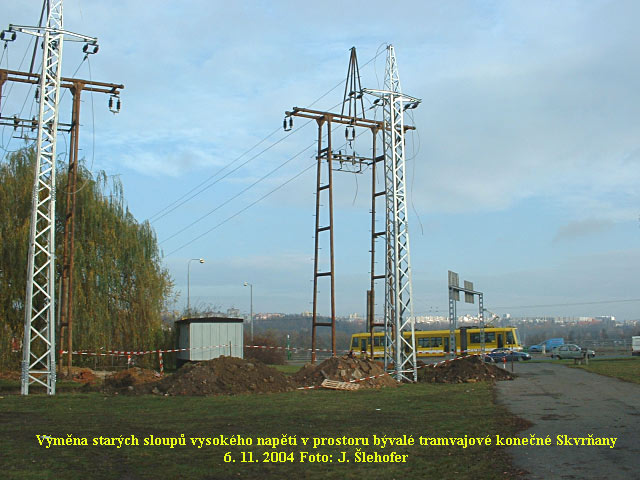 Rekonstrukce tramvajvé trati u zastávky Křimická se soupravpu T3M č. 221+222 29. 10. 1998, foto: Absolut Staré sloupy vysokého napětí, pod kterými bývala dříve smyčka tramvají, byli v listopadu 2004 nahrazeny novými - 6. 11. 2004 V devadesátých letech byla skvrňanská trať postupně v několika letech celá rekonstruována a byl použit systém kolejnic uložených v BKV panelech. V roce 1991 byl zahájen provoz na nové smyčce Malesická v předních Skvrňanech. Až do jara 2000 se zde ve špičkách pracovních dnů otáčelo několik spojů linek č. 3 a 5 z Košutky a Bolevce.