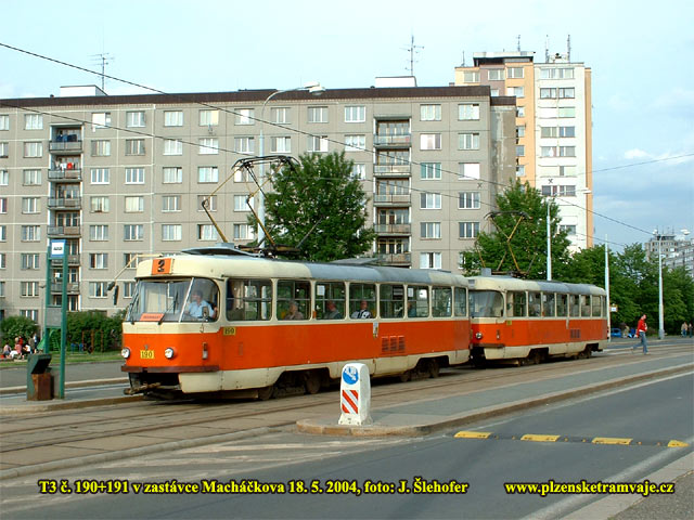 Již neexistující souprava T3 č. 203+193 v zastávce Macháčkova 4. 6. 2000 Sídliště Škvrňany však má díky své západní poloze poměrně čisté ovzduší, hodně zeleně a díky tramvaji rychlé a kapacitní spojení s centrem města. Družstevní výstavbu jmenovanou ve výše uvedeném článku najdeme vlevo od tramvajové trati. Jedná se o cihlové bytovky vystavěné na přelomu sedmdesátých a osmdesátých let. Ulice Waltrova a Zmrhalova (dnes Pecháčkova) a jeden blok Terezie Brzkové - foto vpravo). Takže Škvrňany nejsou jen čistě panelákovým sídlištěm.