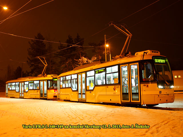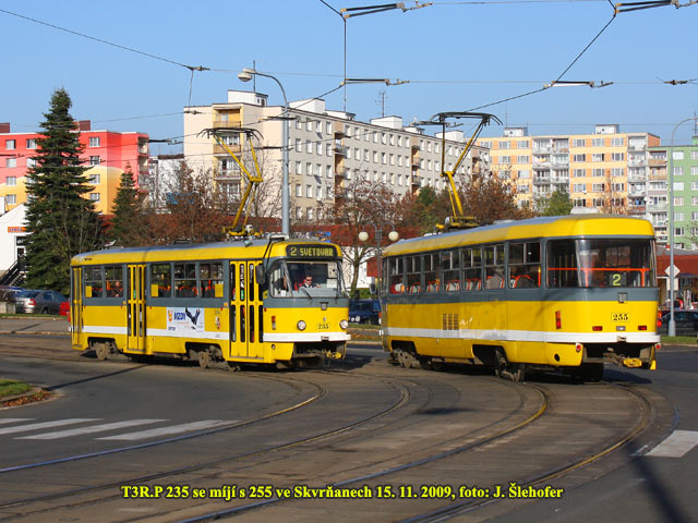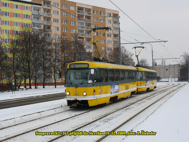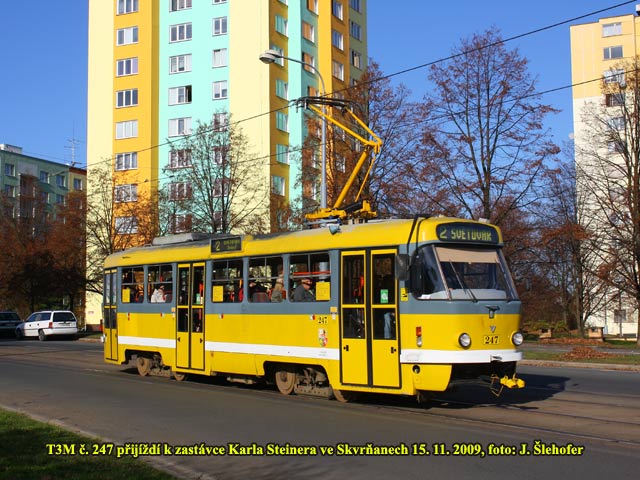 Historická tramvaj T2 č. 133 ve SKvrňanech 12. 9. 2009 T3R.PLF č. 326 ve Skvrňanech 15. 11. 2009 T3M č. 247 přijíždí do zastávky Karla Steinera ve Skvrňanech 15. 11. 2009 Souprava 262+263 přijíždí na konečnou do Skvrňan 19. 12. 2009