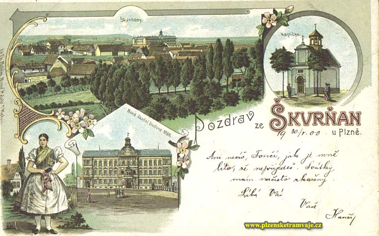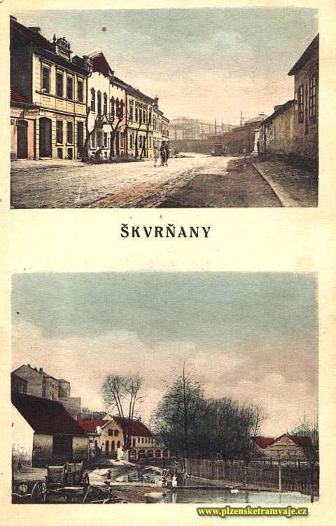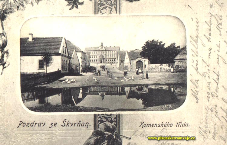 Pozdrav ze Škvrňan z roku 1900 Škvrňany - nahoře zřejmě v místech dnešní DOmažlické třídy, dole Vejprnický potok Škvrňany - v pozadí jediná původní existující stavba - stará škola - 1913 Škvrňany - Komenského třída - cca 1900
