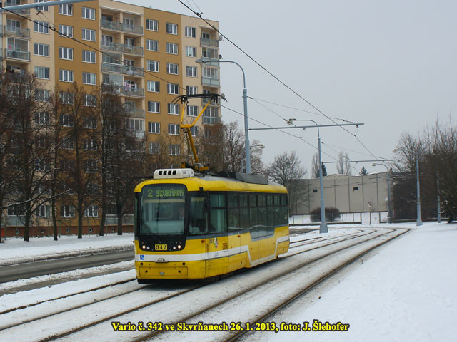 Vario č. 348+349 na konečné Skvrňany 12. 2. 2013 Vario č. 342 ve Skvrňanech 26. 1. 2013 Dnes se zde naopak můžeme setkat s velkým množstvím nejnovějších vozů Vario, neboť na lince č. 2 nejsou žádné zastávky, na kterých by byly problémy s jejich vyklápěcími dveřmi (v počátcích provozu těchto vozů byly problémy např. v Bolevci, ale zastávky byly upraveny a dnes Varia mohou všude).