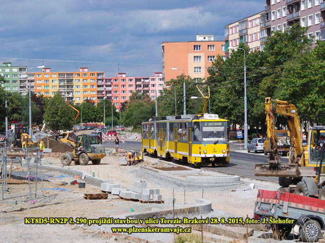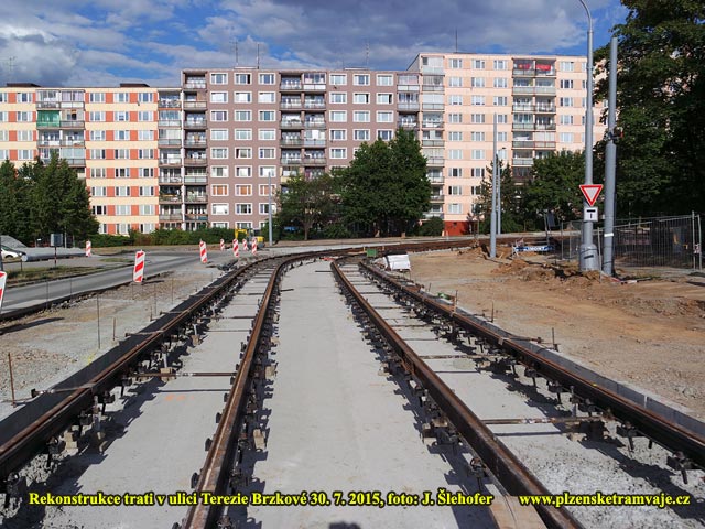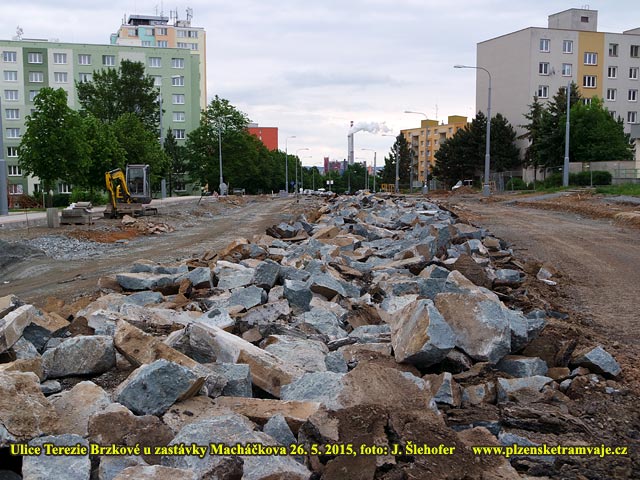 Rekonstrukce trati v ulici Terezie Brzkové u zastávky Macháčkova 29. 6. 2015 Rekonstrukce trati v ulici Terezie Brzkové u zastávky Macháčkova 29. 6. 2015 Rekonstrukce trati v ulici Terezie Brzkové 30. 7. 2015 Tramvaj projíždějící stavbou v ulici Terezie Brzkové 28. 8. 2015