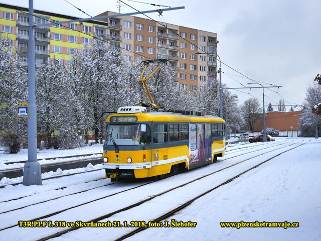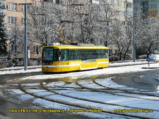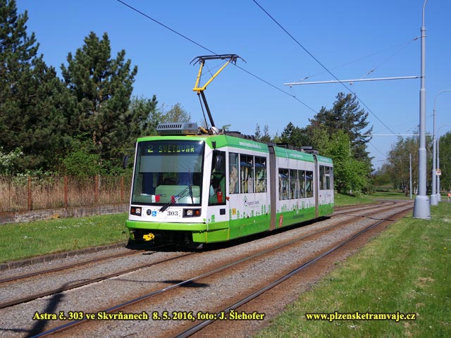 Astra č. 303 ve Skvrňanech 8. 5. 2016 Wana 318 v ulici zastávce Terezie Brzkové 21. 1. 2018 Wana 318 na konečné Skvrňany 21. 1. 2018 Vario 338 v ulici Terezie Brzkové 21. 1. 2018
