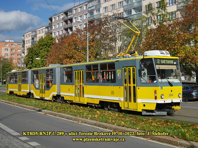 40T č. 385 v zastávce Macháčkova 6. 7. 2022 40T č. 385 u zastávky Malesická 29. 4. 2022 KT8D5-RN2P č. 289 v ulici Terezie Brzkové 19. 10. 2022 40T č. 388 v ulici Terezie Brzkové 24. 5. 2023