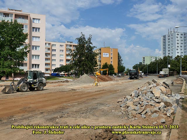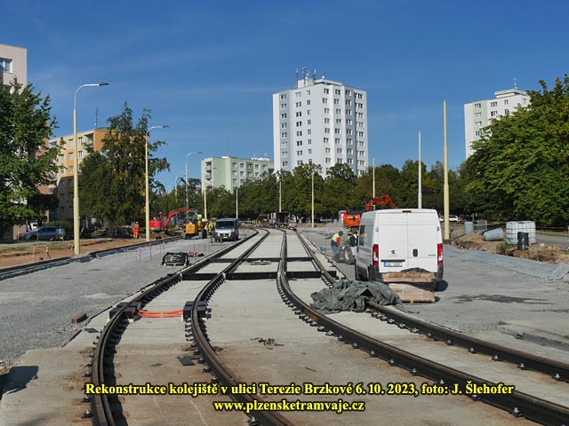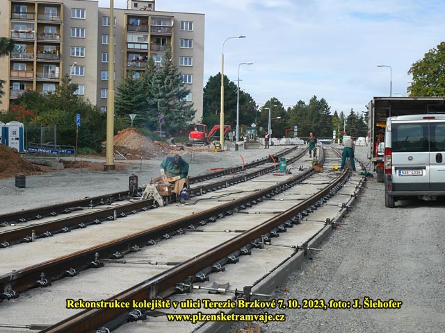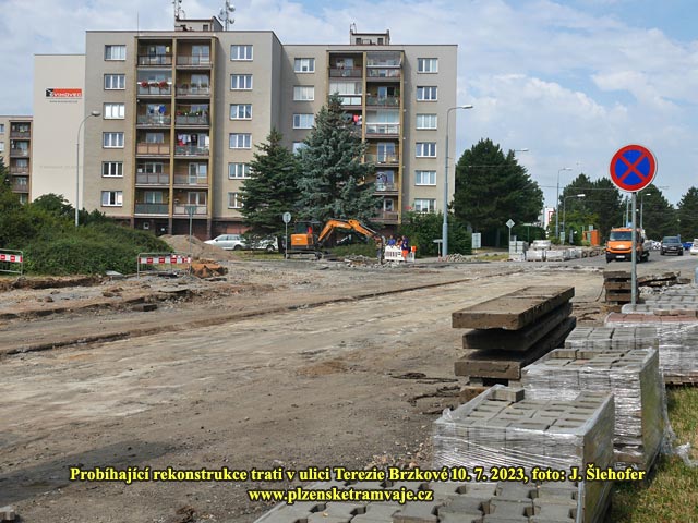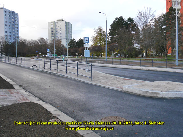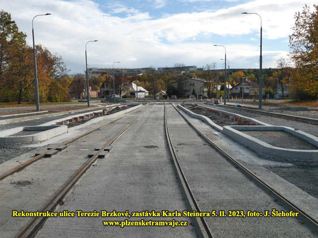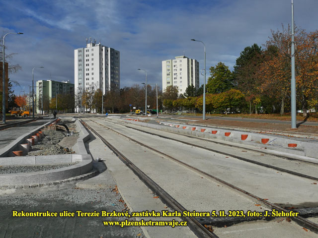 Rekonstrukce ulice Terezie Brzkové v prostou zastávky Karla Steinera 10. 7. 2023 Rekonstrukce ulice Terezie Brzkové 10. 7. 2023 Od 1. 7. 2023 začala ve Skvrňanech rekonstrukce zbývající úseku ulice Terezie Brzkové v úseku mezi křižovatkami s ulicemi Macháčkova a Vejprnická. Nešlo opět jen o rekonstrukci tramvajové trati, ale také celé ulice včetně sítí. Výluka tramvají trvala až listopadu 2023. Ulice je mírně jinak uspořádaná, objevují se i jasně ohraničená parkovací místa, jako v již v předchozí rekonstruované části. Ostrůvky zastávky Karla Steinera dostávají zábradlí a přístřešky pro cestující.