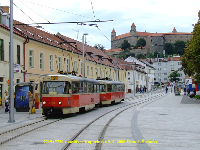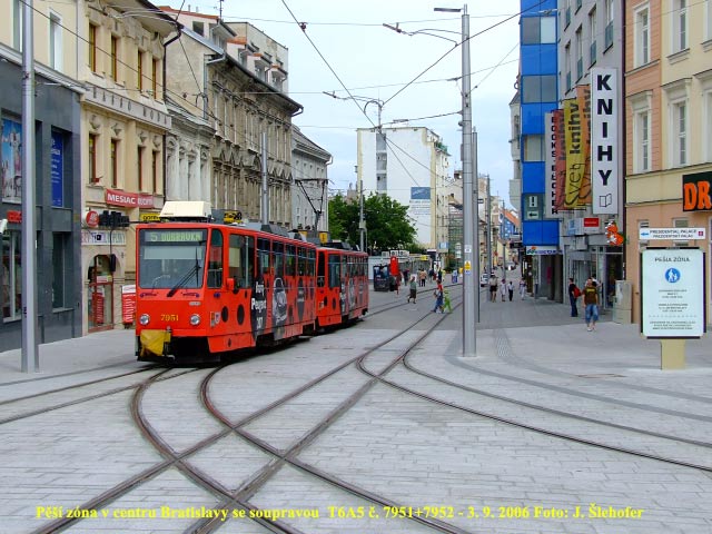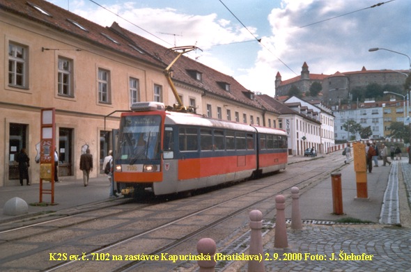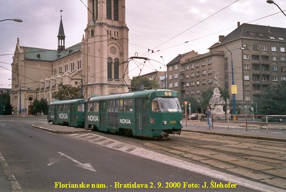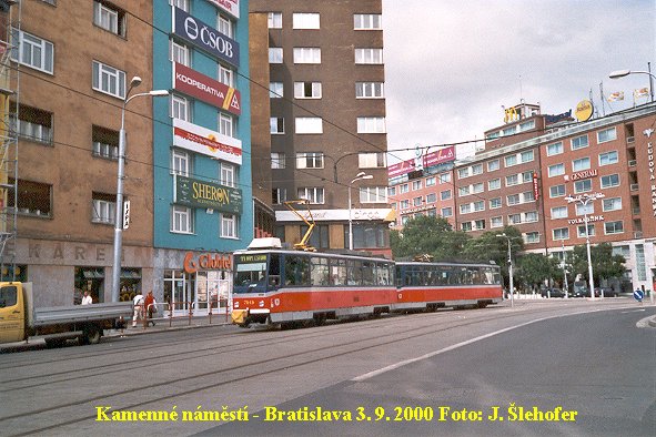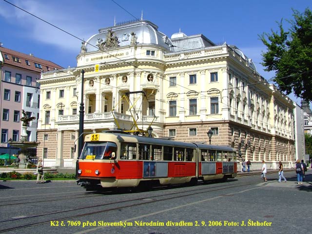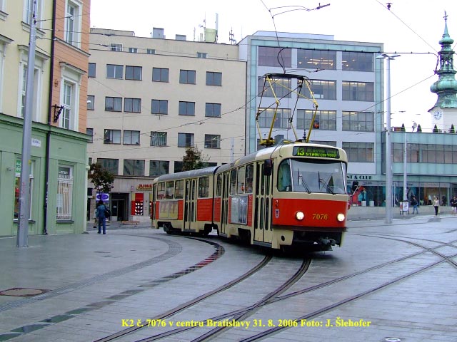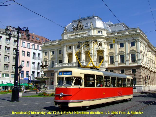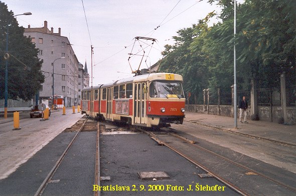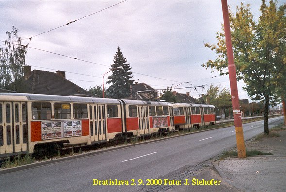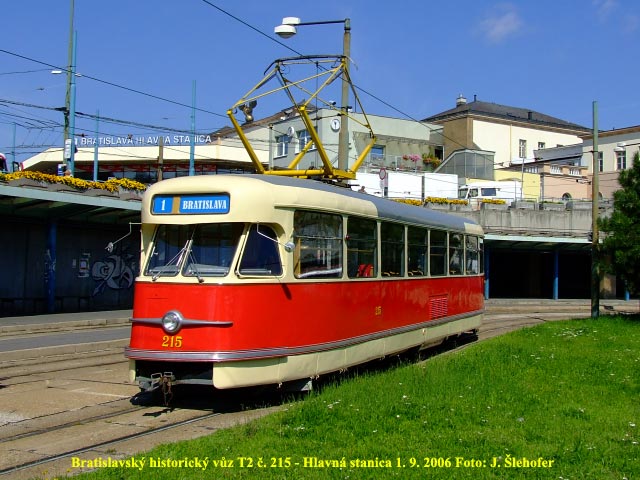 Tyto fotky z roku 2000 pochází z centra Bratislavy, kromě té vpravo, která je z konečné Zlaté Piesky. Následuje pár zajímavých fotografií z léta 2006. Zdejší historický vůz T2 považuji za nejlepší dochovanou Tédvojku vůbec. Podobá se nejvíce plzeňským vozům, které dojezdily v původní podobě s jedním reflektorem a vousy. Pražský muzejní vůz ve Střešovicích je sice také nádherný, ale bohužel se s ním díky tyčovému sběrači příliš často v ulicích nesetkáme.