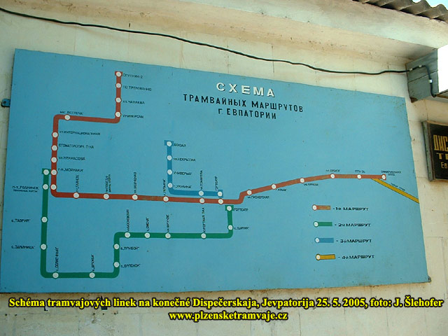 trolejovým vedením. Dle dostupných informací byla však v létě tato linka opět v provozu. Schéma tramvajových linek zachycené na konečné Dispečerskaja je na fotografii vpravo.