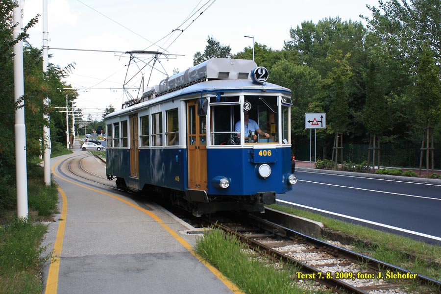 V době mé návštěvy byly v provozu na celé lince tři vozy (402, 404, 406) další minimálně dva stály v Opicíně ve vozovně (č. 405 a 407).
