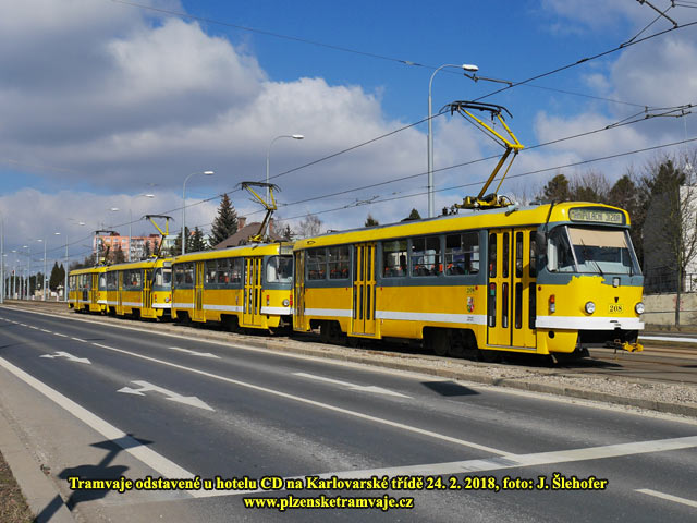 O víkendu a mimo dopravní špičky zůstávají nevyužité tramvaje mimo konečných také na odstavné koleji u hotelu CD na Karlovarské třídě.