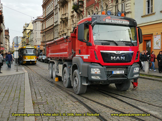 V páteční odpolední špičce 2. 11. 2018 došlo k nebezpečně vypadajícímu střetu nákladního auta s chodcem v Solní ulici. Chodec přecházel mezi stojící tramvají a