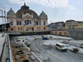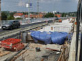 Jižní železniční most již stojí a tak se během srpna u nádraží pokračuje s instalací obrubníků a následně dokončování povrchů. Zejména za jižním mostem na Mikulášské třídě je práce
