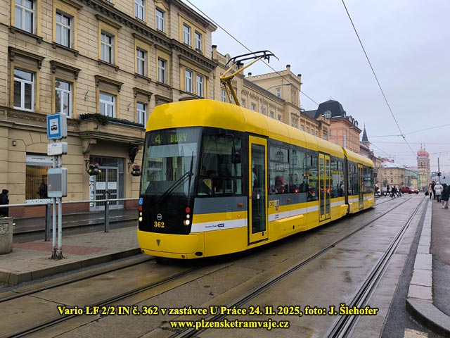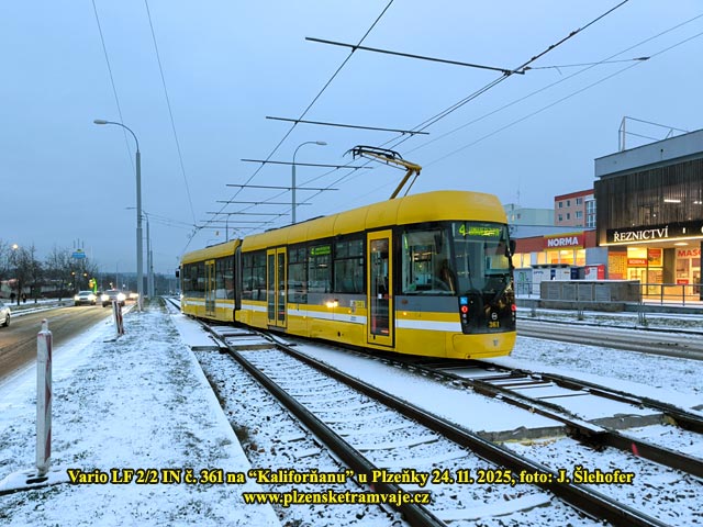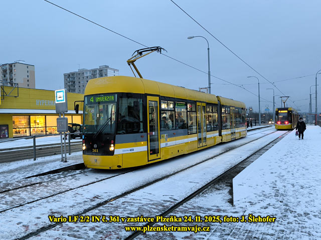 V pondělí 24. 11. 2025 ráno mohlo na lince č. 4 zaskočit někoho překvapení. Tím nemyslím drobnou sněhovou nadílku, která se v Plzni objevila, ale vypravení také kratších tramvají VARIO LF2/2 IN, tedy familiárně pojmenovaných Inka. Vozy 361 a 362 se objevily se na dvou šejdrových pořadích (23 a 24).